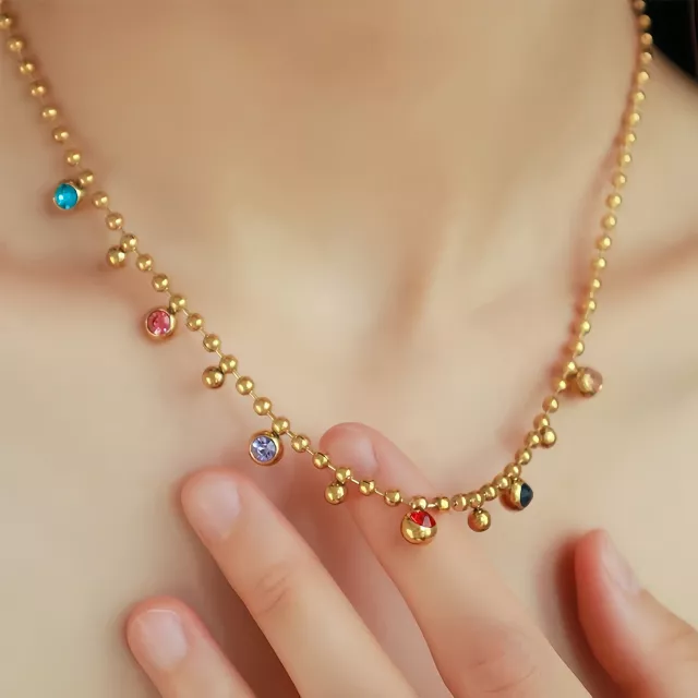 Crafted from durable stainless steel and finished with PVD real gold plating, this necklace is made to last. The hypoallergenic design is gentle on sensitive skin, so you can wear it with confidence. The vibrant rhinestones are securely set, ensuring lasting shine and beauty.
