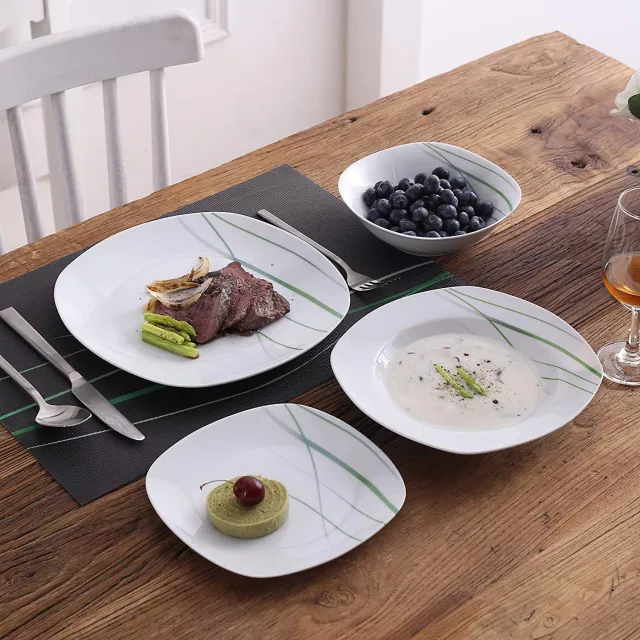 - Includes dinner plates, dessert plates, soup plates, and bowls