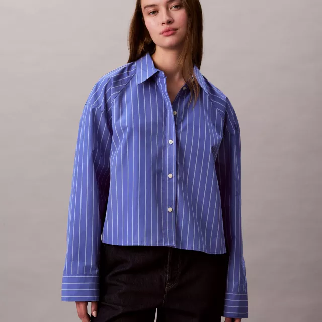 Perfect for sunny spring days or layering over a light jacket, this Calvin Klein Jeans button-down shirt gives off effortless elegance while keeping you comfy. The cropped length and boxy fit work together to create a contemporary look that is both flattering and practical. The versatile blue stripe pattern gives a pop of color without being too loud, making it easy to pair with jeans, skirts, or shorts for a stylish casual look.