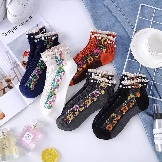 Step into a world of charm and elegance with these Chic Floral Pearl Ankle Socks. Inspired by vintage Lolita style, these socks bring a fresh, retro twist to your wardrobe, blending classic floral patterns with a touch of modern cuteness. Made from a premium blend of cotton, spandex, and polyester, these socks are designed to offer both comfort and style, making them perfect for everyday wear or special occasions.