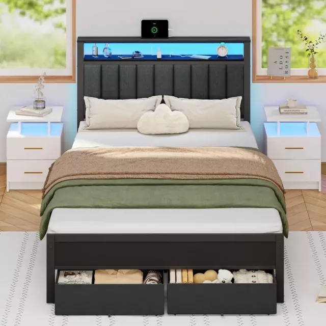 Our Full Size Bed Frame with Charging Station and LED Lights is designed for more than just sleeping. It’s a multifunctional piece that elevates the entire room with its contemporary design, bringing a touch of modern luxury to your bedroom. The built-in storage drawers give you that extra bit of organization you need, while the upholstered headboard provides both comfort and support for those relaxing moments before bed.