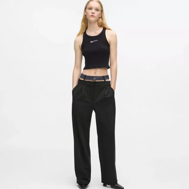 The double waistband design is the standout feature, giving you the freedom to switch up your look effortlessly. The detachable upper waistband adds extra versatility, allowing you to adjust the fit and style with ease. Fastened with a branded shank button, this attention to detail shows the high-quality craftsmanship Karl Lagerfeld is known for.