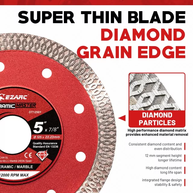 Each blade features a high-performance alloy steel core combined with evenly distributed diamond grit. This advanced construction ensures consistent cutting power, reduced wear, and a longer service life even when used on tough materials. The super thin 1 mm rim minimizes resistance, allowing faster cuts with less effort and reduced heat buildup.