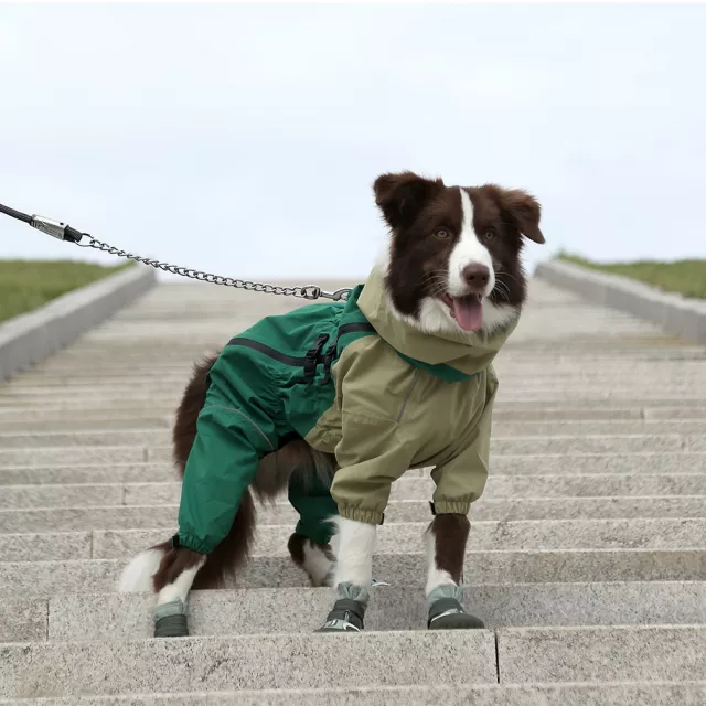 Keep your dog dry, comfortable, and ready for adventure no matter the weather. This full-coverage dog raincoat is designed to protect your pup from rain, wind, and cold while allowing complete freedom of movement. With its four-legged design and high-neck hood, it wraps your dog in reliable protection from head to tail. Whether it’s a light drizzle or a heavy downpour, this stormcoat helps your dog stay warm and clean during every walk.