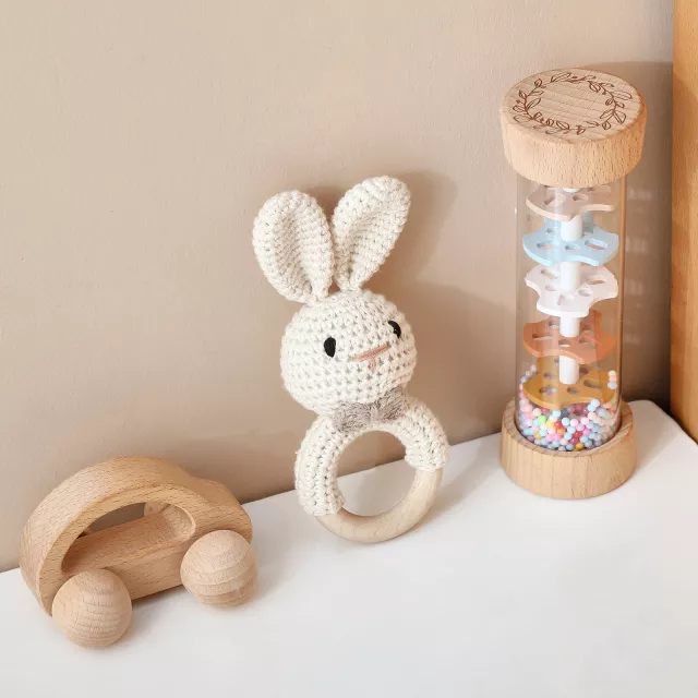 This sensory toy is thoughtfully crafted for infants and young children from birth through early childhood. It combines sound, motion, and touch to support early developmental milestones. Babies love turning and shaking the cylinders, while toddlers enjoy exploring rhythm, coordination, and cause-and-effect through play. The smooth wooden surface is comfortable for small hands and safe for everyday use.