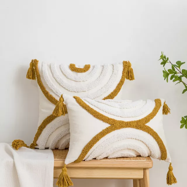 Refresh your home with this beautifully designed yellow geometric arc pillow cover that instantly adds warmth, personality, and a relaxed bohemian vibe to any room. With its eye-catching arc pattern and soft, inviting texture, this pillow cover is an easy way to update your décor without changing your entire setup. The cheerful yellow tone brightens your space while still feeling calm and cozy, making it perfect for everyday living.